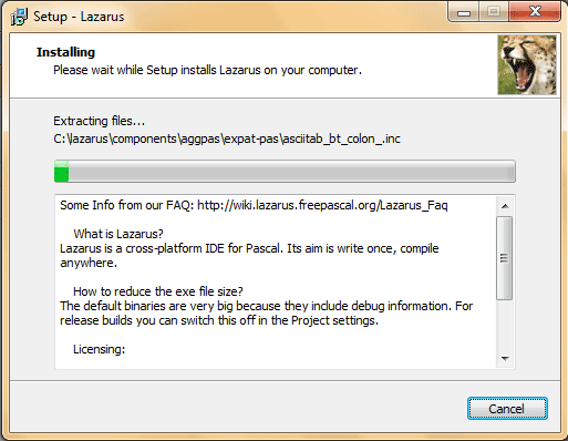 Notice that Lazarus is installed in C:\Lazarus directory. You can choose any other drives if you want (like D:\Lazarus) but you should not install it in a folder with spaces in its name (such as C:\lazarus ide).